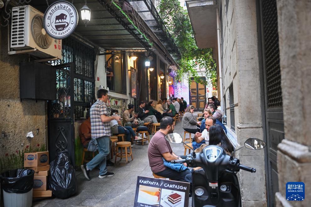 11月22日,顾客们在土耳其伊斯坦布尔的曼达巴特马兹咖啡店外的巷道里喝咖啡。新华社记者 刘磊 摄