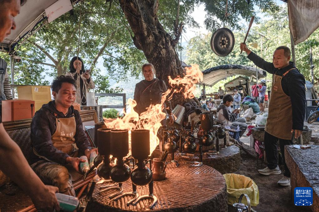 11月15日,在云南省保山市隆阳区芒宽乡的“路边咖啡馆”,店员(右)敲锣配合咖啡师制作“火烧咖啡”。新华社记者 王冠森 摄