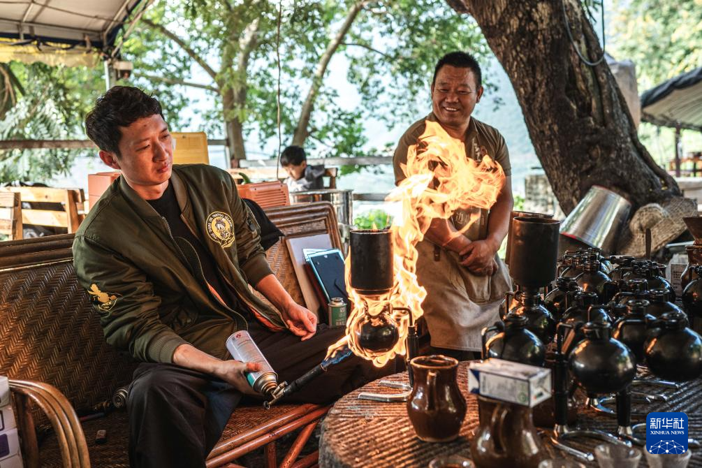 喷枪的火舌增温,虹吸壶内的咖啡粉随沸水翻动。峡谷里独特的咖啡萃取方式和怒江水一同携着咖香,流向远方。随着“火烧咖啡”走红网络,咖叔也有了知名度。