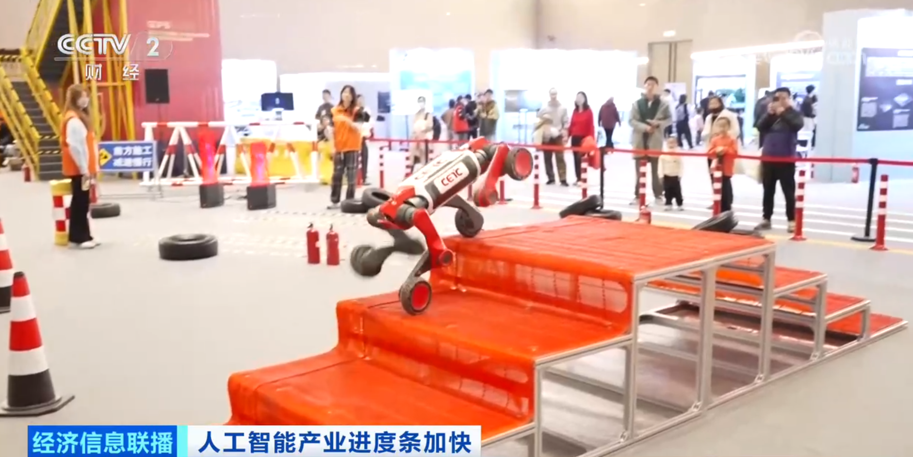 应急救援竞技场裁判员 张雷:我们选的这些场景,全部都是和日常应急救援过程当中直接相关联,作为我们评分的规则,比如载重、时间。人工智能的未来就是希望帮助我们做一些极端条件下的工作。