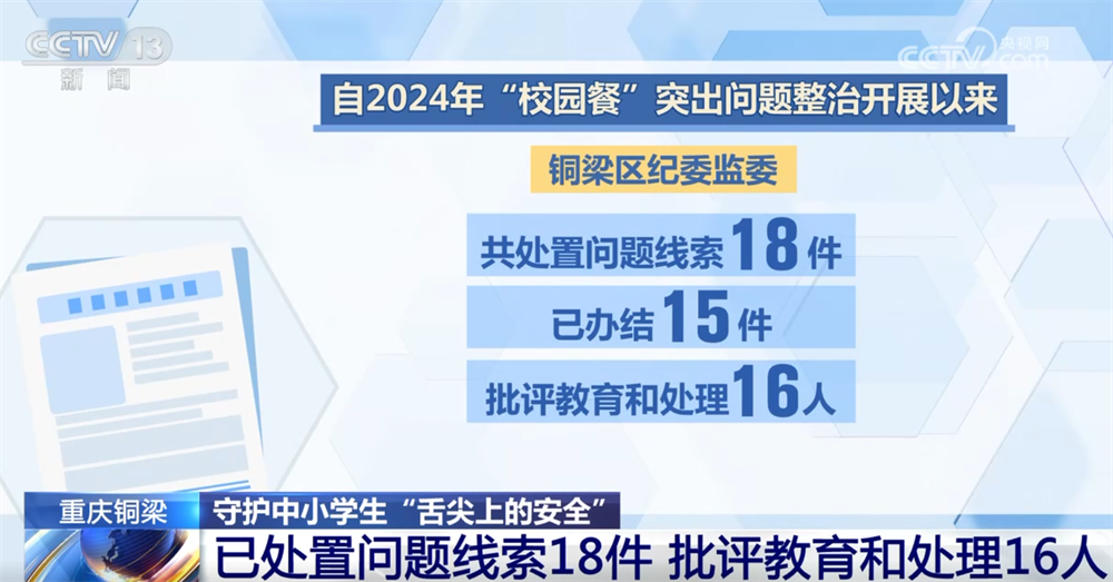 针对这些问题,铜梁区纪委监委联合区教委、财政、市场监管等部门持续加强监督检查,严查快处发现的违纪违法问题。自2024年“校园餐”突出问题整治开展以来,共处置问题线索18件,已办结15件,批评教育和处理16人。同时,推动铜梁区教委等部门对学校食堂采购、用餐等制度进行改革,要求学校食材的采购、验收和加工过程、标注原料种类和数量的营养食谱等向监管部门、学生家长等进行公开。学校食堂要实现师生用餐的食材同源、菜品价格相同,师生菜品同锅加工、同窗取餐,就餐场所师生共享,推动食堂“阳光运行”,常态化接受监督。