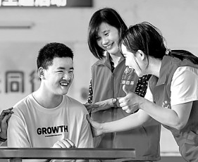 湖南省永州市道县特殊教育学校,道县妇幼保健院的医生志愿者在鼓励残障孩子。蒋克青摄/光明图片