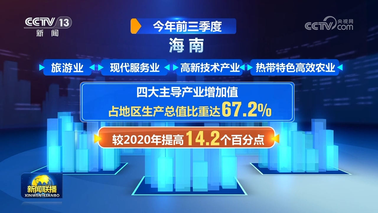 在琼海,博鳌乐城国际医疗旅游先行区特许创新药械与国际同步,为万千病患带来健康希望;在陵水黎安,26所中外知名高校签约入驻,10个中外合作办学机构(项目)获批落地,“不出国也能留学”成为现实。今年前三季度,海南旅游业、现代服务业、高新技术产业和热带特色高效农业四大主导产业增加值,占地区生产总值比重达67.2%,较2020年提高14.2个百分点。