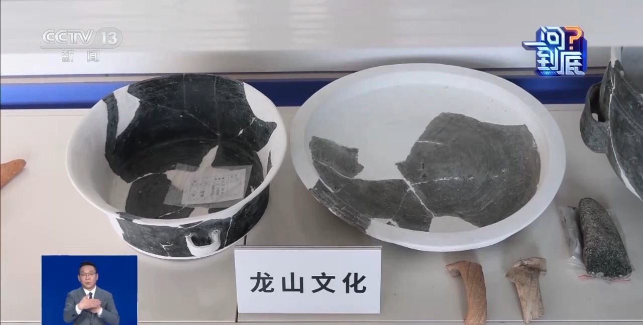 济南市考古研究院副院长 房振:这个是龙山文化带有刻画纹饰的陶片,从这个残存陶片的形制来看,我们现在推测它应该是一个器盖,可能类似于我们现在的杯子盖。在器盖的表面,它刻有一个比较精美的纹饰,应该是类似于这个商代青铜器上的兽面纹,从它本身这种黑陶材质,以及它上面刻画的纹饰来看,它应该是当时作为一个礼器,像是平时祭祀用的。