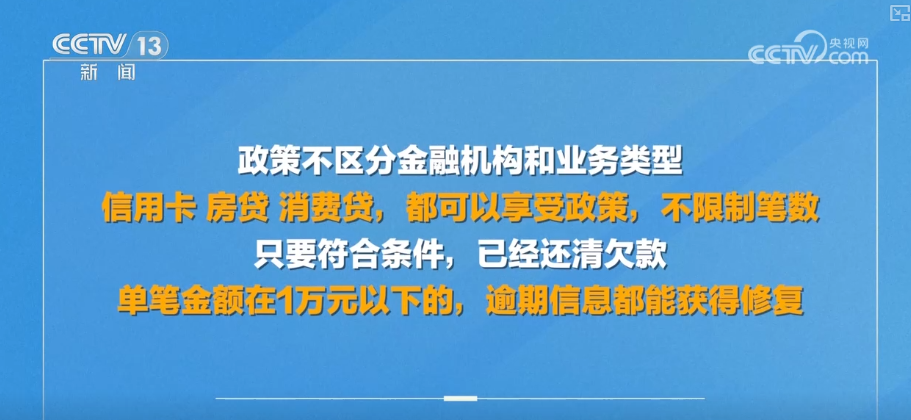 第一,政策不区分金融机构和业务类型,也就是无论你是信用卡还是房贷还是消费贷都可以享受这个政策。同时,也不限制笔数,只要符合条件、已经还清欠款、单笔金额在1万元以下的逾期信息,都能获得修复。