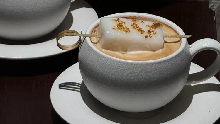 除了品类不断升级,年糕的吃法也在年轻人中玩出了新花样。一位年轻顾客告诉记者,相比蒸、煮、炒等传统做法,她更愿意尝试创意吃法。“这是最近很火的 ‘糖桂花年糕拿铁’,不少人专门为这款饮品打卡,我也打算去尝尝看。”记者在大众点评上查询发现,这款饮品售价为 35 元一杯,是餐厅的招牌菜,还登上了平台推荐热榜,成了名副其实的“年糕网红”。