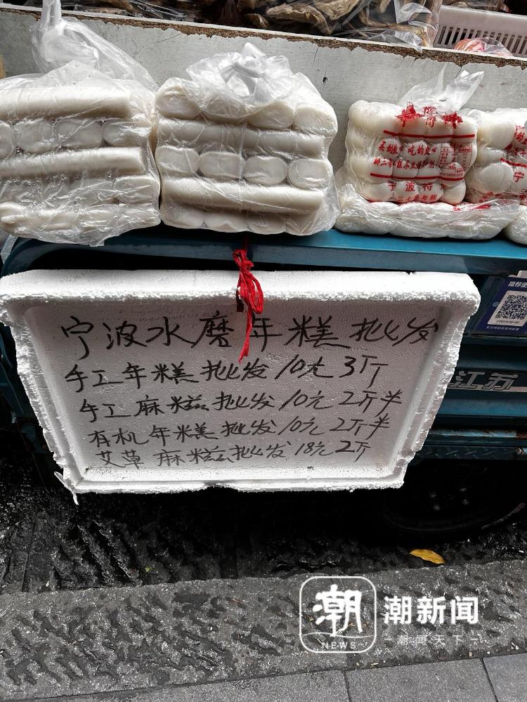 “前阵子普通宁波年糕批发价 2.5 元一斤,现在涨了一点,但和去年差不多。” 摊位老板娘一边整理着年糕,一边告诉记者,“我们卖的都是传统水磨年糕,纯手工制作的。”