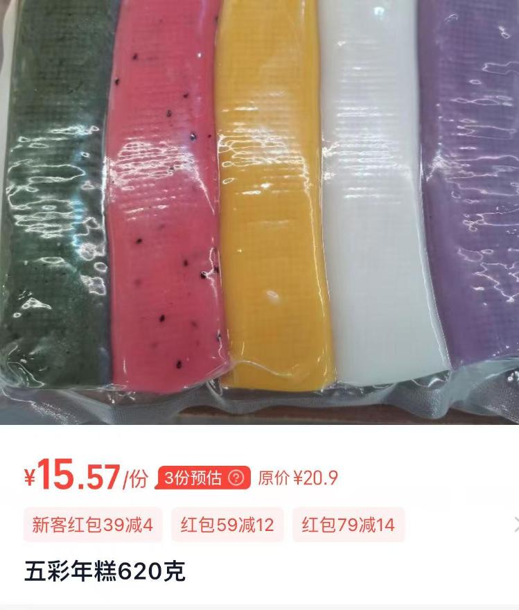 和基础款年糕的亲民路线不同,特色款年糕的价格则拉开了明显差距。记者在多个线上平台看到,主打健康概念的五彩年糕近期销量火爆,单价高达 16.8 元/斤。据了解,这类年糕用菠菜汁、南瓜泥、紫薯泥等天然食材调色,凭借高颜值和节日仪式感,俘获了不少消费者的芳心。