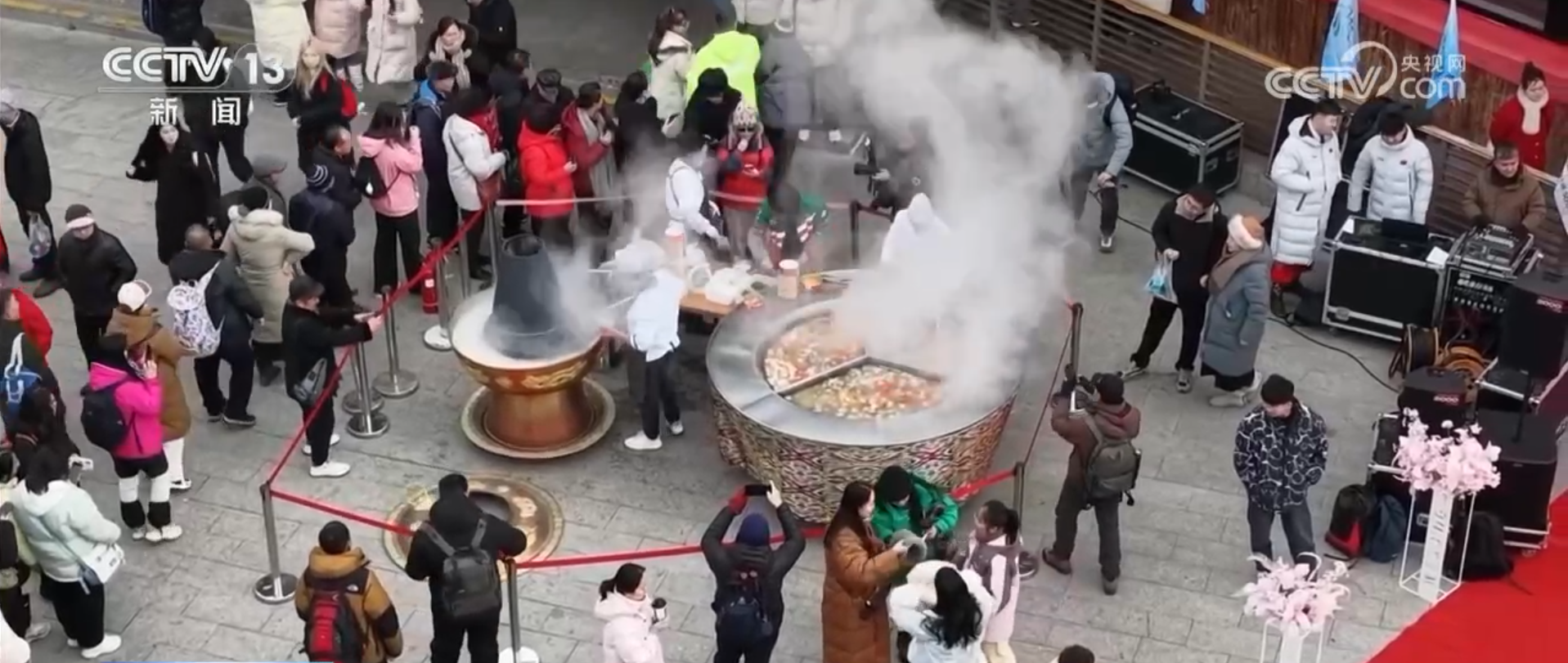 冬日的天山天池银装素裹,湖畔却热闹非凡。21日、景区“大锅羊肉节”启幕,直径近2米的巨型铁锅炖煮着鲜嫩羊肉,香气四溢。游客凭门票兑换消费券,就能优惠品尝羊肉、馕饼等新疆特色美食,精彩的歌舞表演更将现场氛围推向高潮。