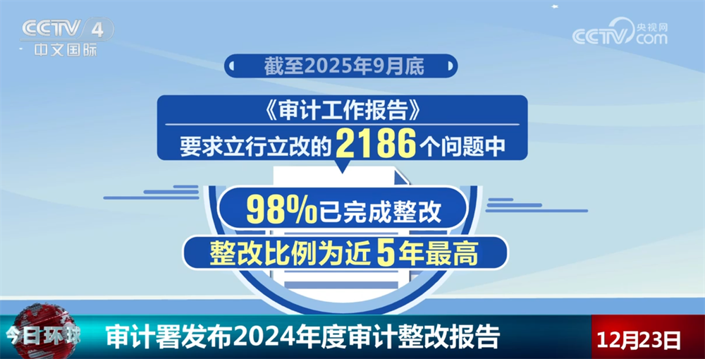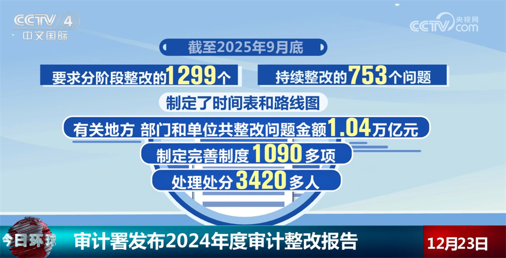 截至2025年9月底,《审计工作报告》要求立行立改的2186个问题中,98%已完成整改,整改比例为近5年最高;要求分阶段整改的1299个、持续整改的753个问题,制定了时间表和路线图。有关地方、部门和单位共整改问题金额1.04万亿元,制定完善制度1090多项,处理处分3420多人。重大问题整改总体进展顺利,解决了一些不利于经济高质量发展的体制机制问题。