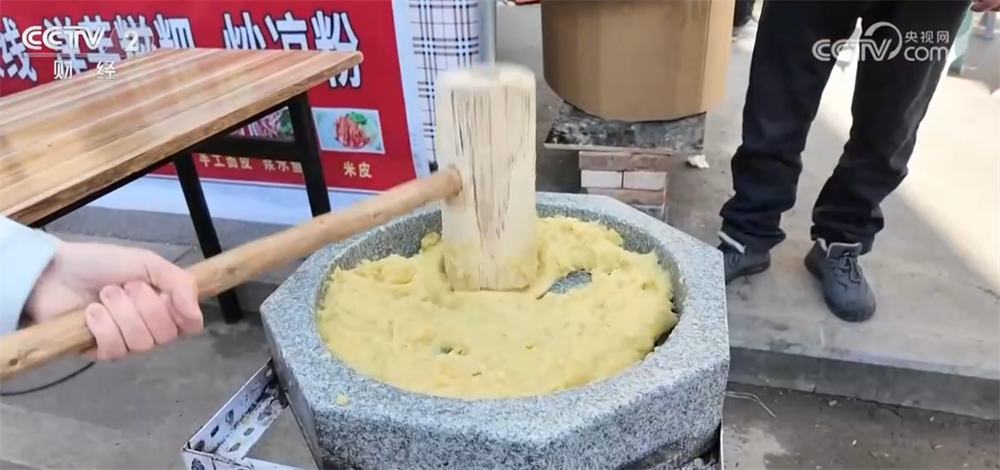 焦岱大集的美食名片还有很多,焦岱牛肉就是其中的代表。炖得软烂的牛肉配上蒜泥、醋汁和油泼辣子等各色调料,酸香可口、滋味十足!此外,极富盛名的荞面饸饹现压现卖,非常新鲜。集市上的主角还有打制洋芋糍粑的大石臼,摊主们得空就会举起大锤捣上几杵,经过时间和力道的共同作用,普通的土豆变身为筋道美味的洋芋糍粑。