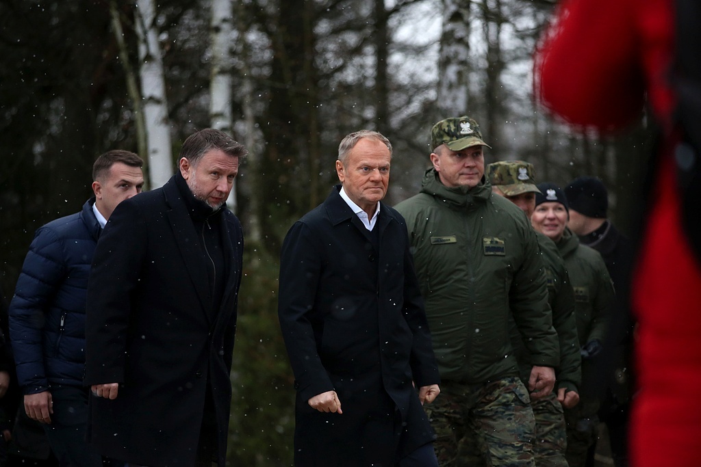 △波兰总理图斯克(中)与波兰内政和行政部长马尔钦·凯尔温斯基(左二)视察边境哨所