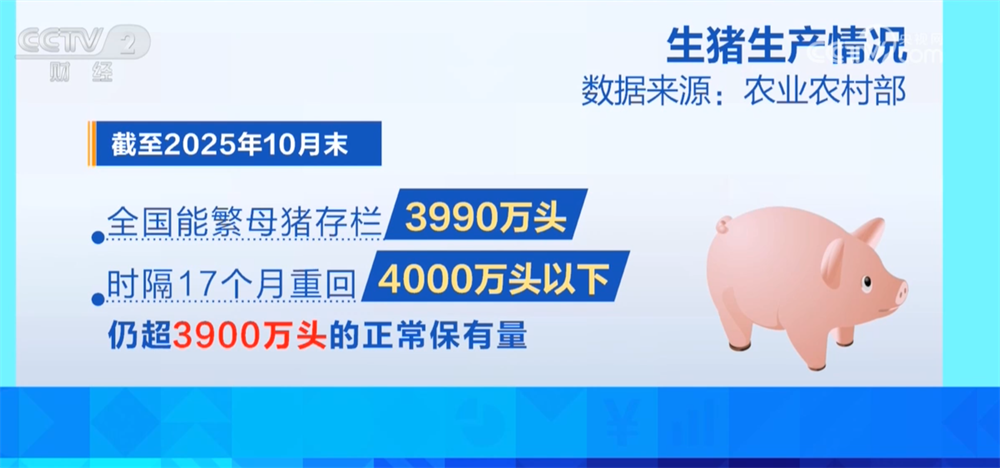 业内人士表示,当前南方气温下降缓慢,南方腌腊需求释放不及预期。同时,明年春节时间相对较晚,也延迟了部分集中采购的需求,消费端对猪价的支撑力度有限。而供应端的压力仍在,由于前两年生猪养殖效益较高,行业产能出现扩张。农业农村部的数据显示,截至今年三季度末,全国生猪存栏4.37亿头,同比增长2.3%。前三季度全国生猪出栏5.3亿头,同比增长1.8%。截至今年10月末,全国能繁母猪存栏3990万头,时隔17个月重回4000万头以下,但仍超过3900万头的正常保有量。