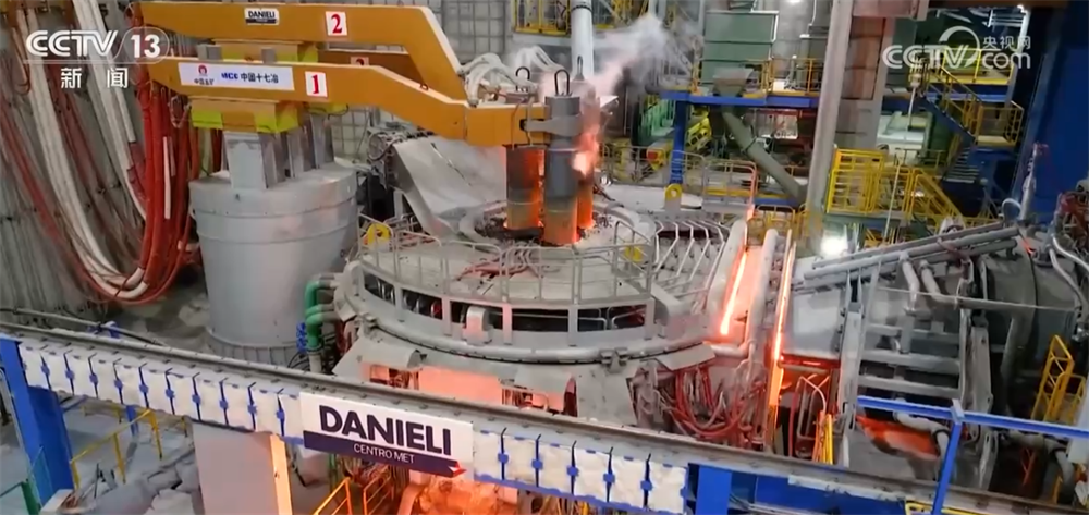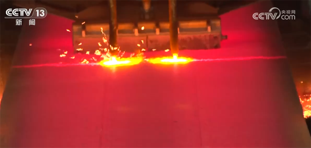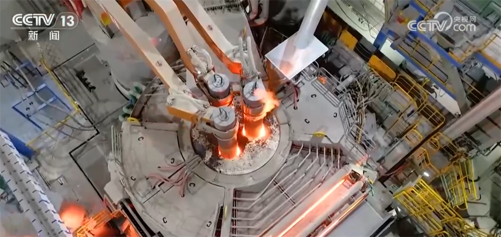 记者身后是国内最大的电炉,这也是炼钢的中间环节。它一次可以冶炼220吨钢水,这些钢水可以制造大约300辆汽车。它可以产生80000安培的强大电流,最高温度可达5000℃。与传统“高炉+转炉”长流程炼钢相比,这种电炉省去了烧结、焦化等高耗能环节,生产流程缩短40%,碳排放降低80%以上。