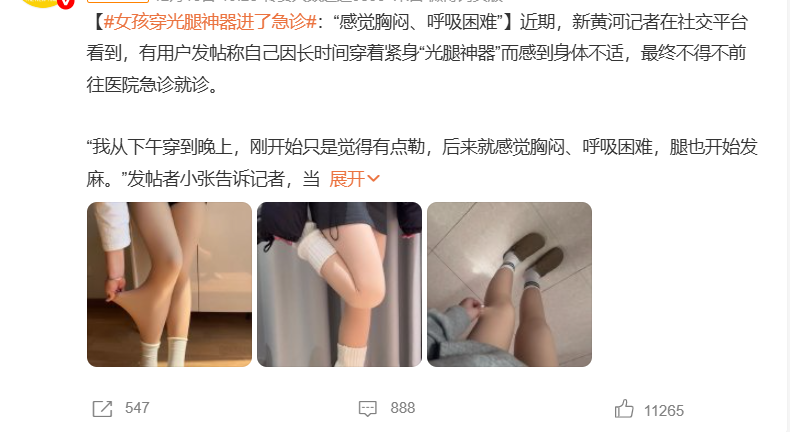 有用户在社交平台发帖称,自己因长时间穿着紧身“光腿神器”而感到身体不适,最终不得不前往医院急诊就诊。