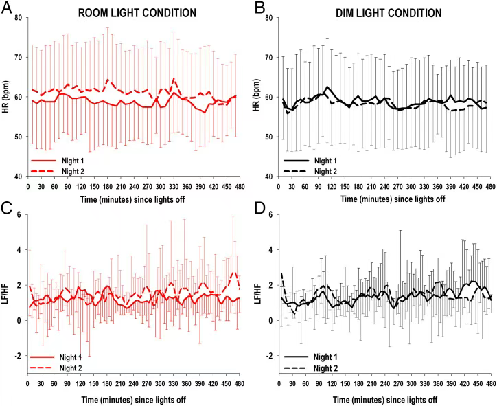 那么,光污染会怎么影响到我们的身体的呢?为了探究这个问题,研究人员把20名参与者分别安排在昏暗的房间以及开灯的房间中入眠,在夜间同步监测他们的心率。