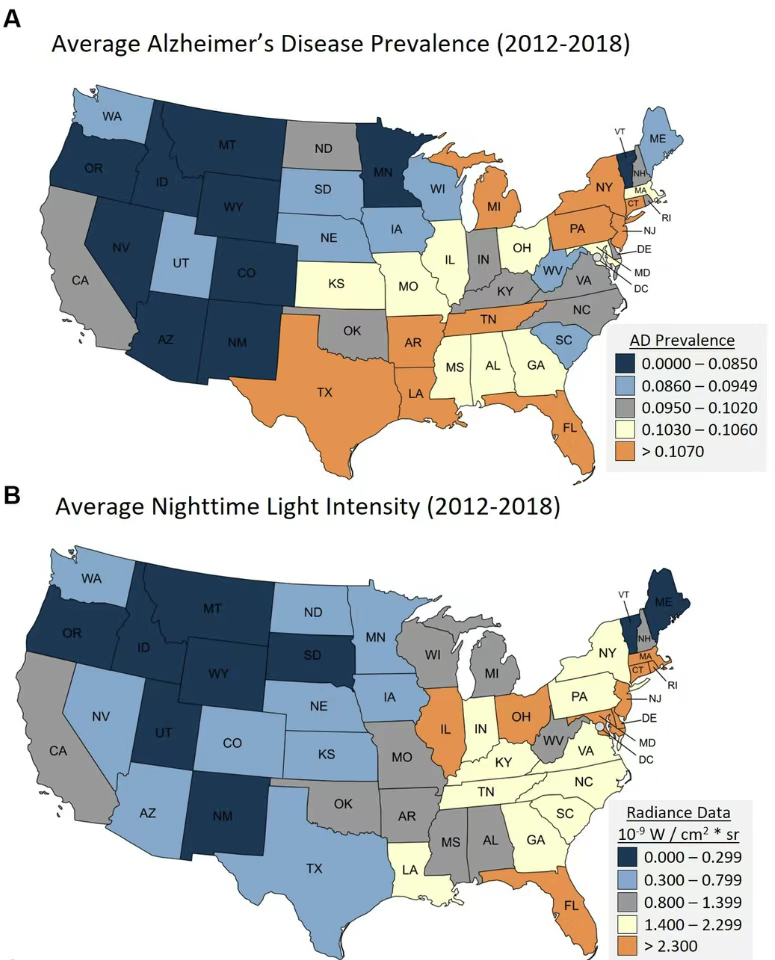 这项研究的科研人员把美国48个州的光污染情况和本地区的医疗记录进行了比对,令人惊讶的是,他们竟然发现光污染和阿尔兹海默病之间存在显著正相关,这种巧合也引起了科研人员的兴趣。