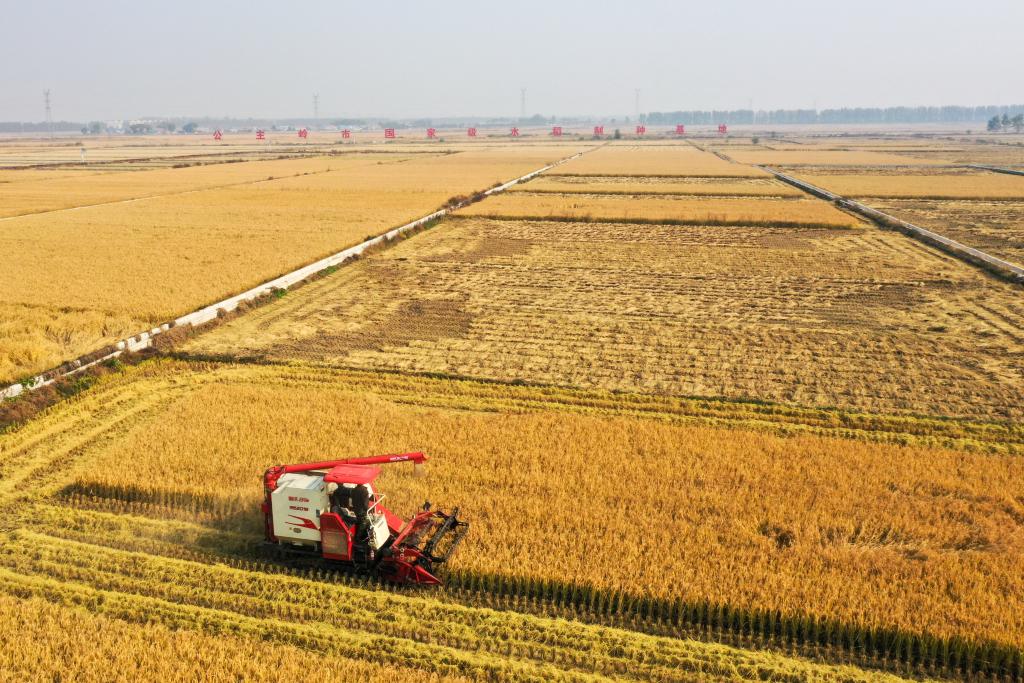 2025年10月14日,在吉林省公主岭市,农民驾驶农机收割水稻(无人机照片)。新华社记者 张楠 摄