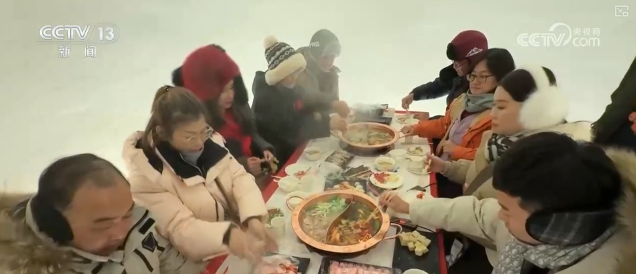 为了提升游客的体验感,2025年,当地还打造了特色雪屋。游客不仅能在雪屋内围炉享用热气腾腾的火锅,还能在夜晚参与热闹的篝火晚会,体验“冰火两重天”的乐趣。