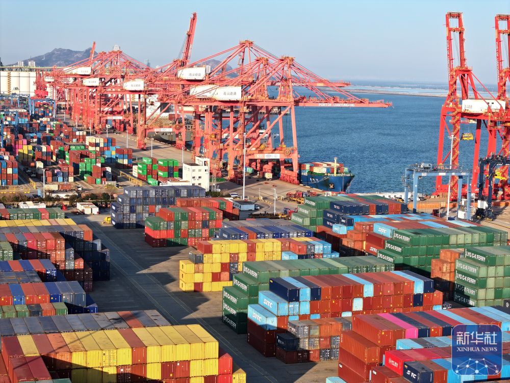 ↑ 1月2日,货轮停在江苏省连云港港集装箱码头泊位装卸集装箱(无人机照片)。新华社发(王春摄)