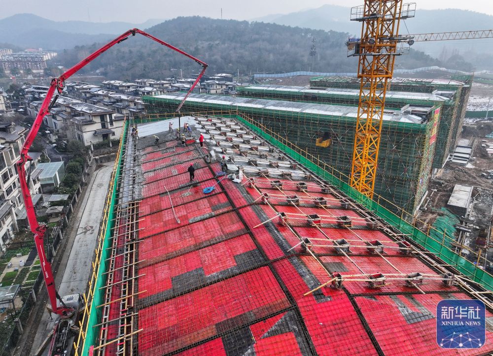 ↑ 1月2日,工人在湖北省襄阳市麒麟中学建设项目工地浇筑屋面水泥(无人机照片)。新华社发(谢勇摄)