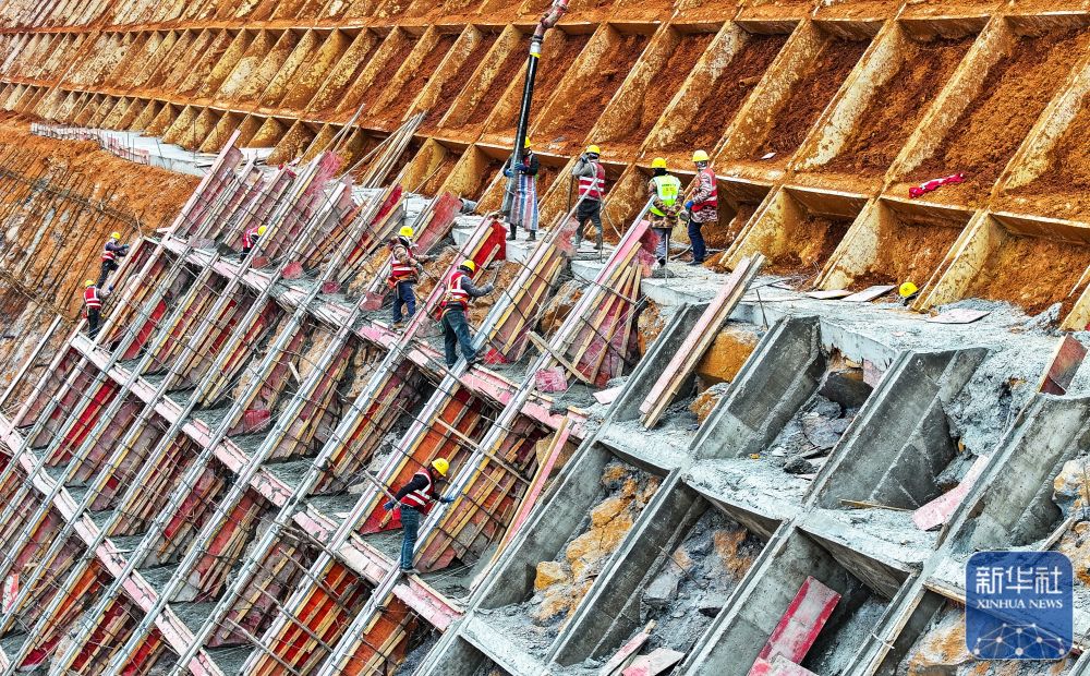 ↑ 1月2日,在位于湖南省永州市新田县龙泉街道石甑源村的桂(东)新(田)高速建设工地,工人们进行防护坡施工作业(无人机照片)。新华社发(刘贵雄摄)
