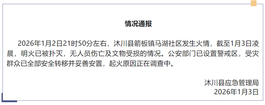 央视网消息:1月3日,四川省乐山市沐川县应急管理局发布情况通报:1月2日21时50分左右,沐川县箭板镇马湖社区发生火情,截至1月3日凌晨,明火已被扑灭,无人员伤亡及文物受损的情况。起火原因正在调查中。