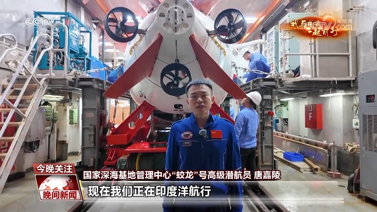 国家深海基地管理中心“蛟龙”号高级潜航员 唐嘉陵:大家好,我是“蛟龙”号高级潜航员唐嘉陵,很高兴又在《晚间新闻》栏目和大家见面了。我们现在正在印度洋航行,执行海洋生态环境调查任务。现在是(当地时间)早上的六点,“蛟龙”号正在备潜,这一次我将作为主驾驶执行下潜任务,这也是“蛟龙”号(2025年)的第91次下潜,今天也是“蛟龙”号(2025年)在海上的第286天。