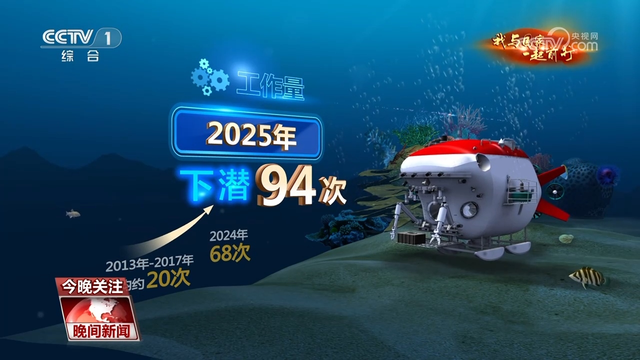 再来看工作量。从2013年到2017年,整个五年,“蛟龙”号共下潜接近100次,年均大约20次。而2024年,“蛟龙”号下潜了68次;2025年,下潜了94次。
