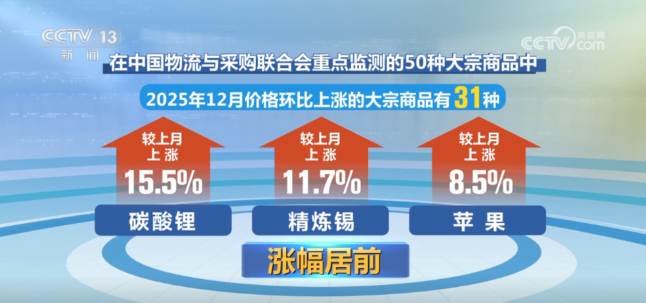 在中国物流与采购联合会重点监测的50种大宗商品中,2025年12月价格环比上涨的大宗商品有31种。其中,碳酸锂、精炼锡和苹果涨幅居前,较上月分别上涨15.5%、11.7%和8.5%。