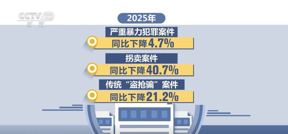 2025年,全国公安机关共立刑事案件数同比下降12.8%,立案数再创本世纪以来新低,立治安案件数同比下降3.5%。其中,严重暴力犯罪、拐卖、传统“盗抢骗”案件分别同比下降4.7%、40.7%、21.2%。