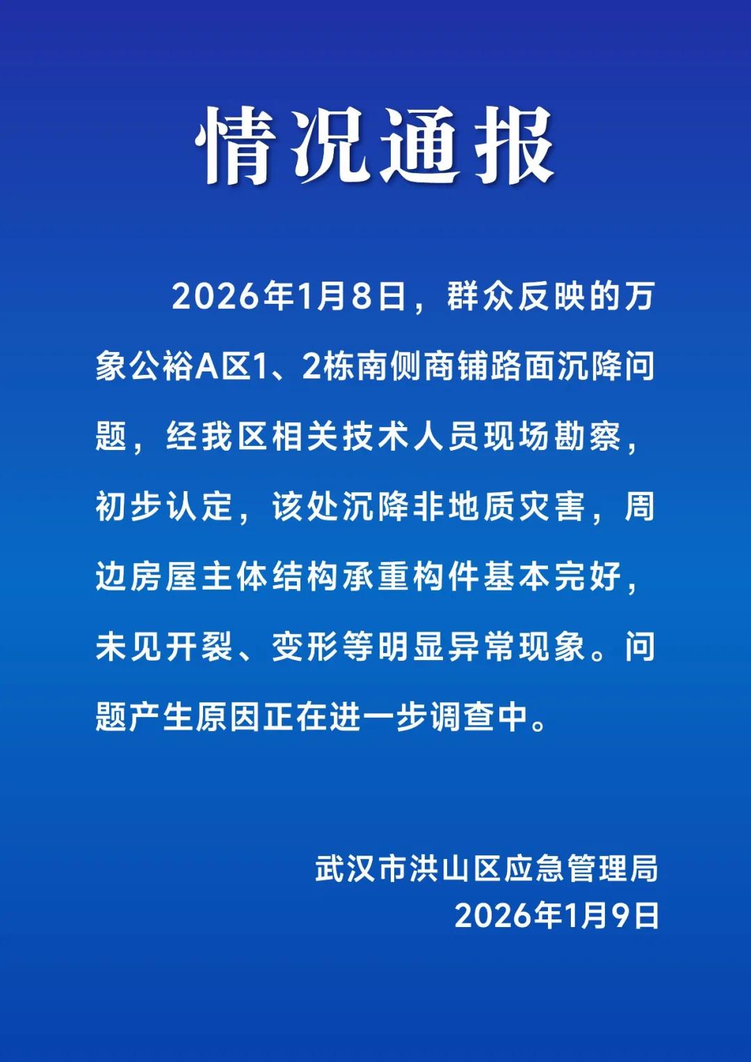 央视网消息:武汉市洪山区应急管理局1月9日通报,1月8日,群众反映的万象公裕A区1、2栋南侧商铺路面沉降问题,经洪山区相关技术人员现场勘察,初步认定,该处沉降非地质灾害,周边房屋主体结构承重构件基本完好,未见开裂、变形等明显异常现象。问题产生原因正在进一步调查中。