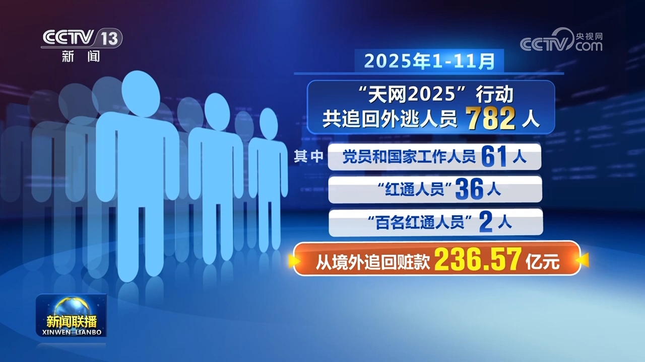 2025年,中央纪委国家监委网站发布了65名中管干部涉嫌严重违纪违法接受审查调查的消息。2025年1—11月,“天网2025”行动共追回外逃人员782人,其中党员和国家工作人员61人、“红通人员”36人,“百名红通人员”2人,从境外追回赃款236.57亿元。