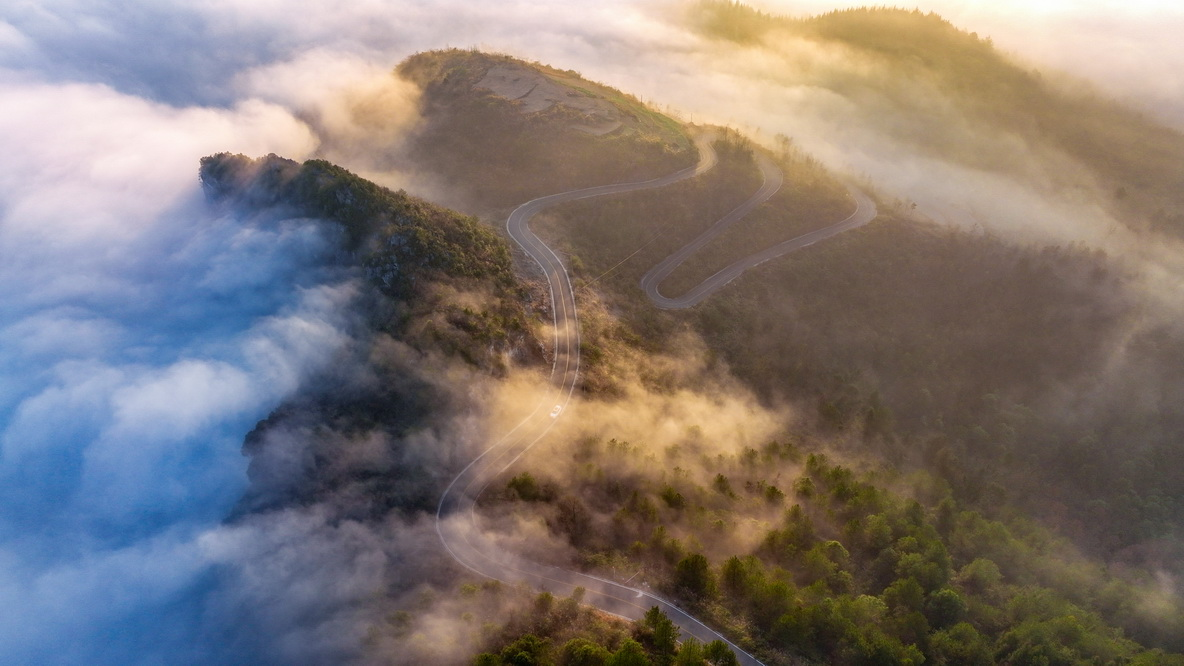 1月11日清晨,重庆市酉阳土家族苗族自治县丁市镇岩门底云端公路,平流雾如纱幔漫过蜿蜒山道,公路似“银龙”穿梭云海。