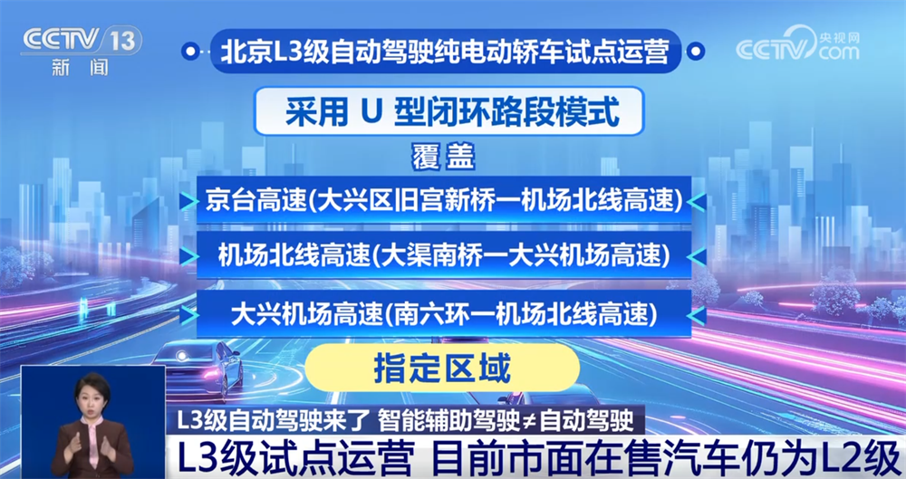 近日,北京这家获批L3级自动驾驶车型的纯电动轿车正式开启规模化上路通行试点运营,试点采用U型闭环路段模式,覆盖“京台高速(大兴区旧宫新桥一机场北线高速)、机场北线高速(大渠南桥一大兴机场高速)及大兴机场高速(南六环一机场北线高速)”指定区域,可以实现高速公路和城市快速路单车道内最高时速80公里的自动驾驶功能。