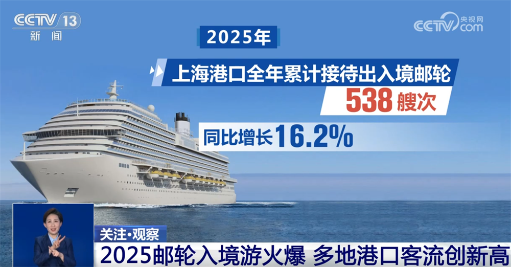 央视网消息:过去的一年,外国游客入境游持续火爆,其中也包括邮轮入境游。自外国旅游团邮轮入境免签政策实施以来,上海、天津、厦门等几大港口客流持续“爆单”。2025年,上海港口全年累计接待出入境邮轮538艘次,同比增长16.2%;天津国际邮轮母港接待出入境旅客超40万人次;厦门口岸接待邮轮同比增长129%。政策红利持续释放,让“坐着邮轮游中国”成为全球游客的便捷选择。