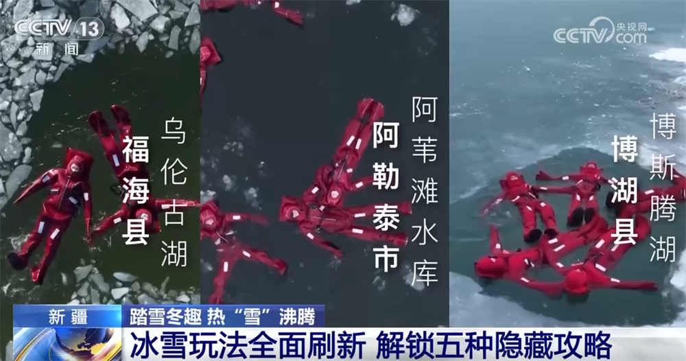 不只是冰钓,这个冬季,新疆的各大冰湖还兴起了一项“冰浮挑战”。参与者在安全员的全程看护下,身穿特制的防寒浮力服,系好安全索,缓缓躺进冰湖之中,瞬间变身成一只只“冰镇小龙虾”。