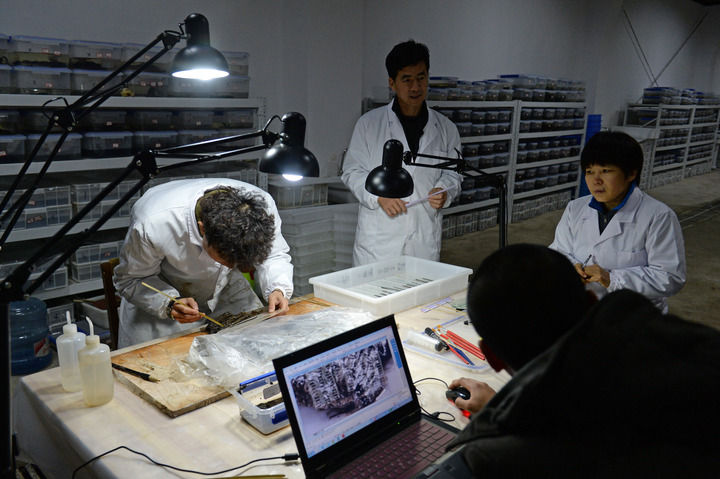 文保人员在江西南昌西汉海昏侯墓遗址文保用房内对出土的竹简进行剥离(2015年11月24日摄)。新华社记者 万象 摄