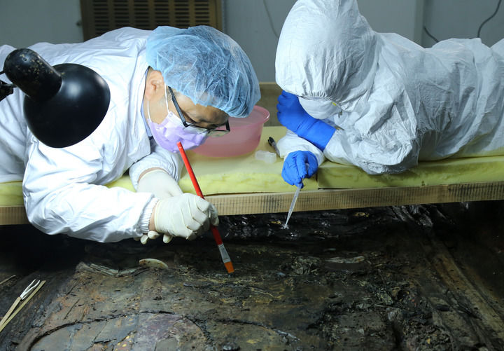 考古工作者在实验室环境下提取海昏侯墓主棺内的文物(资料照片)。新华社发(江西省文物考古研究院供图)