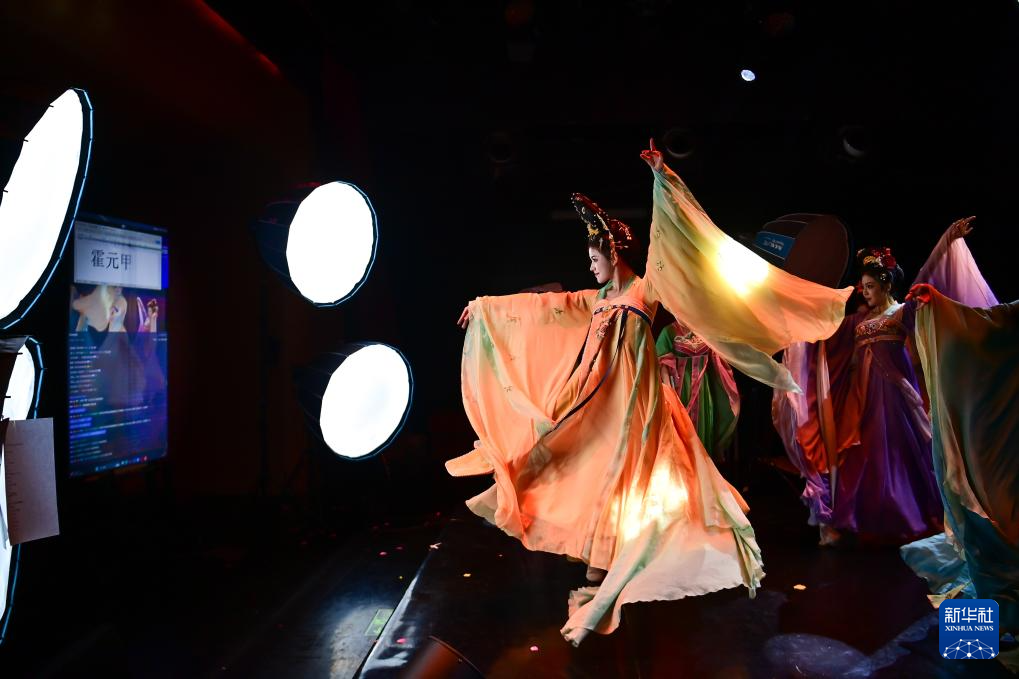 陕西省歌舞剧院的舞蹈演员在直播间进行“团播”表演(2025年12月25日摄)。新华社记者 邹竞一 摄