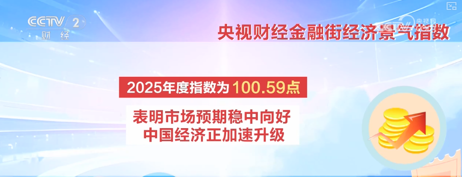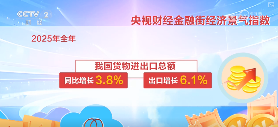 作为国内首个以金融视角展示中国经济景气程度的指数——“央视财经金融街经济景气指数”,2025年度指数为100.59点,表明市场预期稳中向好,中国经济正加速升级。其中,2025年全年,我国货物进出口总额同比增长3.8%,出口增长6.1%。我国制造业年内“量质齐升”,制造业增加值占全球比重近30%,制造业规模有望连续16年保持全球第一。