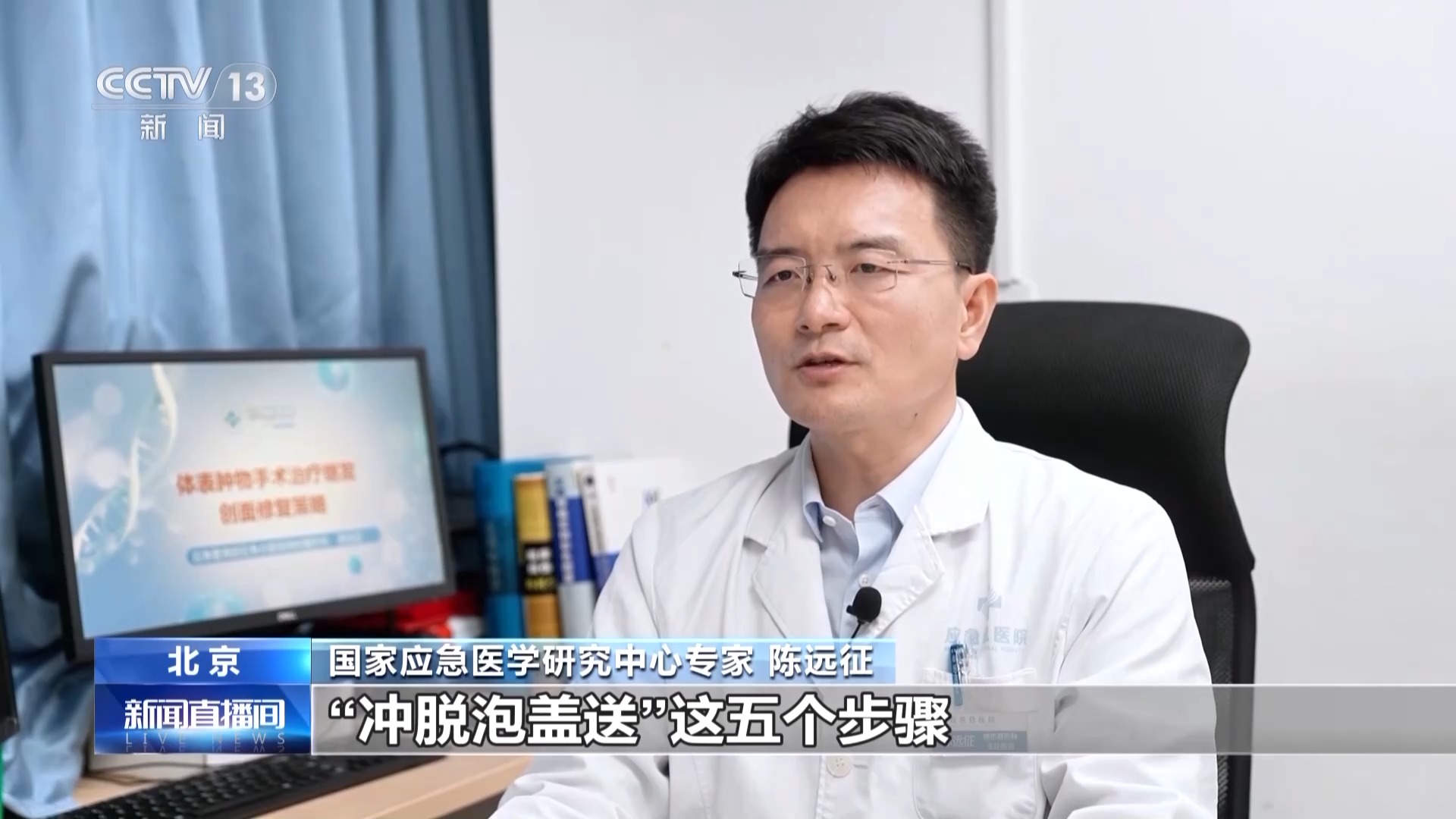 国家应急医学研究中心专家 陈远征:“冲脱泡盖送”这五个步骤在现场急救中至关重要,能够有效防止创面加深,为后期治疗创造良好的条件。