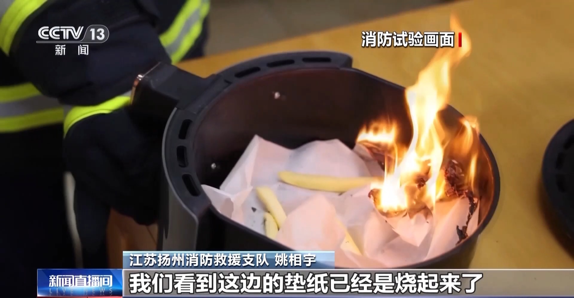 总台央视记者 王晨:在消防试验当中,我们看到空气炸锅里的垫纸被点燃,它在工作的时候可以达到上百度,如果食物放置太少或者是不均匀,就很容易造成这样的隐患。