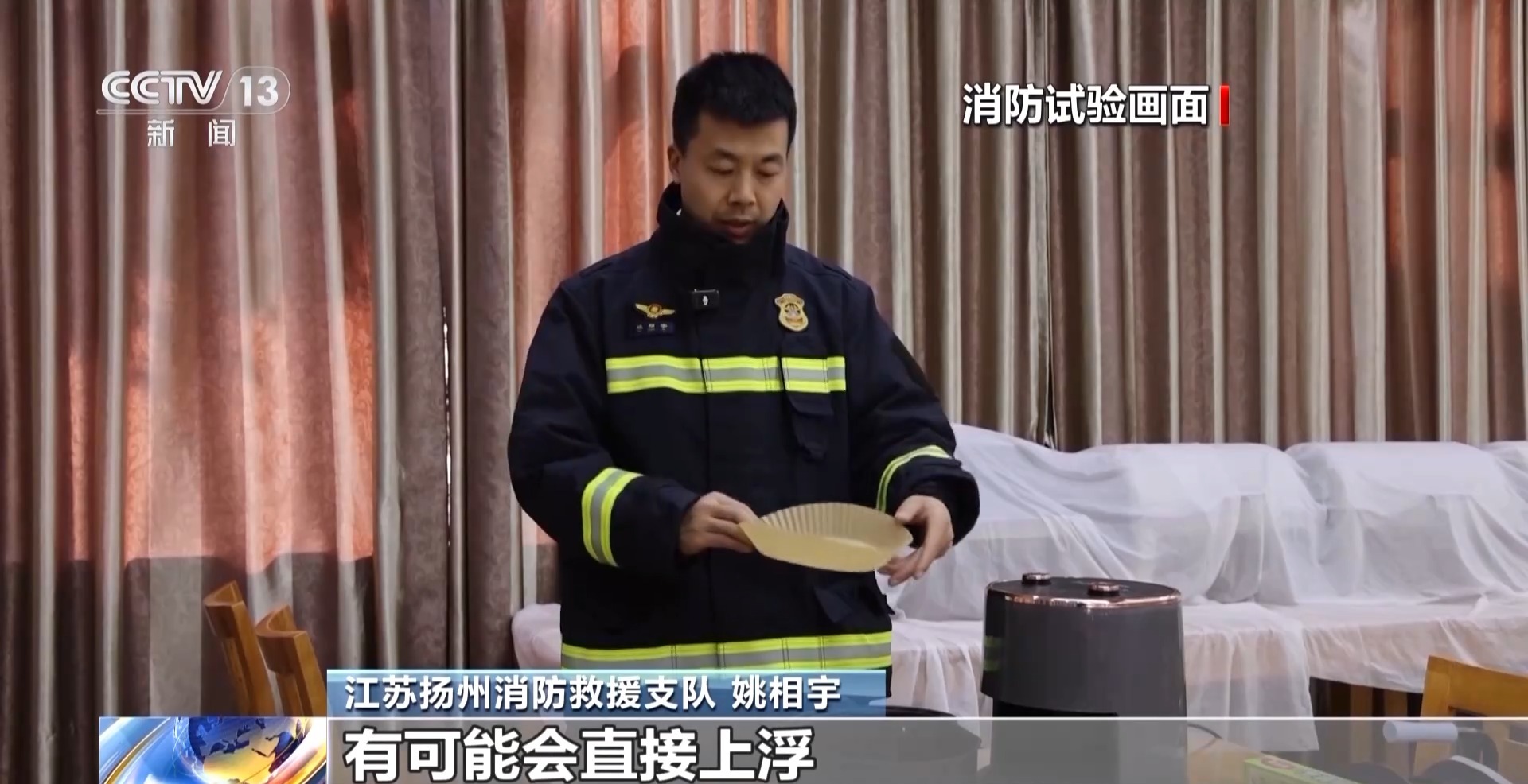消防员 姚相宇:我们使用空气炸锅的托盘垫纸,它的质地都是比较轻的,在空气炸锅风扇的风力作用下,有可能会直接上浮,接触到上面的加热器。