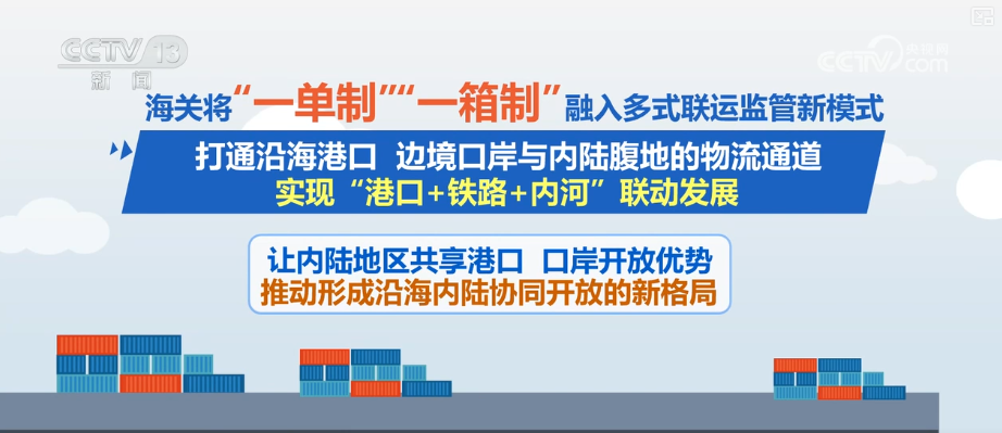 海关将“一单制”“一箱制”融入多式联运监管新模式,打通沿海港口、边境口岸与内陆腹地的物流通道,实现“港口+铁路+内河”联动发展。让内陆地区共享港口、口岸开放优势,推动形成沿海内陆协同开放的新格局。