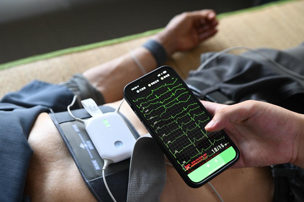 在江苏省海安市曲塘镇刘圩村卫生室,医生为村民进行心电图检查。新华社记者 季春鹏 摄
