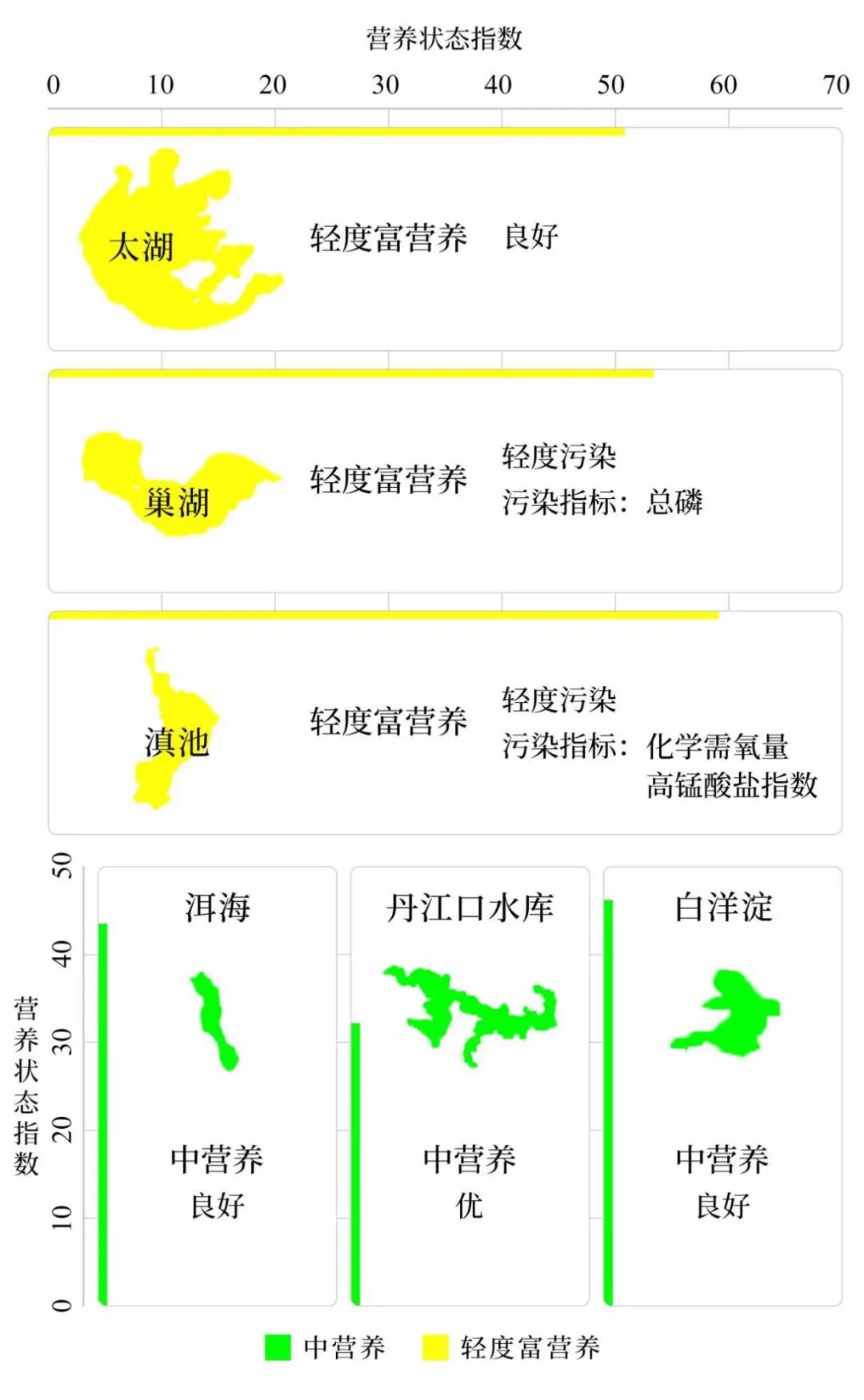 1—12月,监测的209个重点湖(库)中,水质优良(Ⅰ—Ⅲ类)湖库个数占比78.5%,同比上升1.4个百分点;劣Ⅴ类水质湖库个数占比3.3%,同比下降1.0个百分点。主要超标指标为总磷、化学需氧量和高锰酸盐指数。204个监测营养状态的湖(库)中,中度富营养的3个,占1.5%;轻度富营养的55个,占27.0%;其余湖(库)为中营养或贫营养状态。其中,太湖水质良好、轻度富营养;巢湖为轻度污染、轻度富营养,主要超标指标为总磷;滇池为轻度污染、轻度富营养,主要超标指标为化学需氧量和高锰酸盐指数;洱海和白洋淀水质良好、中营养;丹江口水库水质为优、中营养。