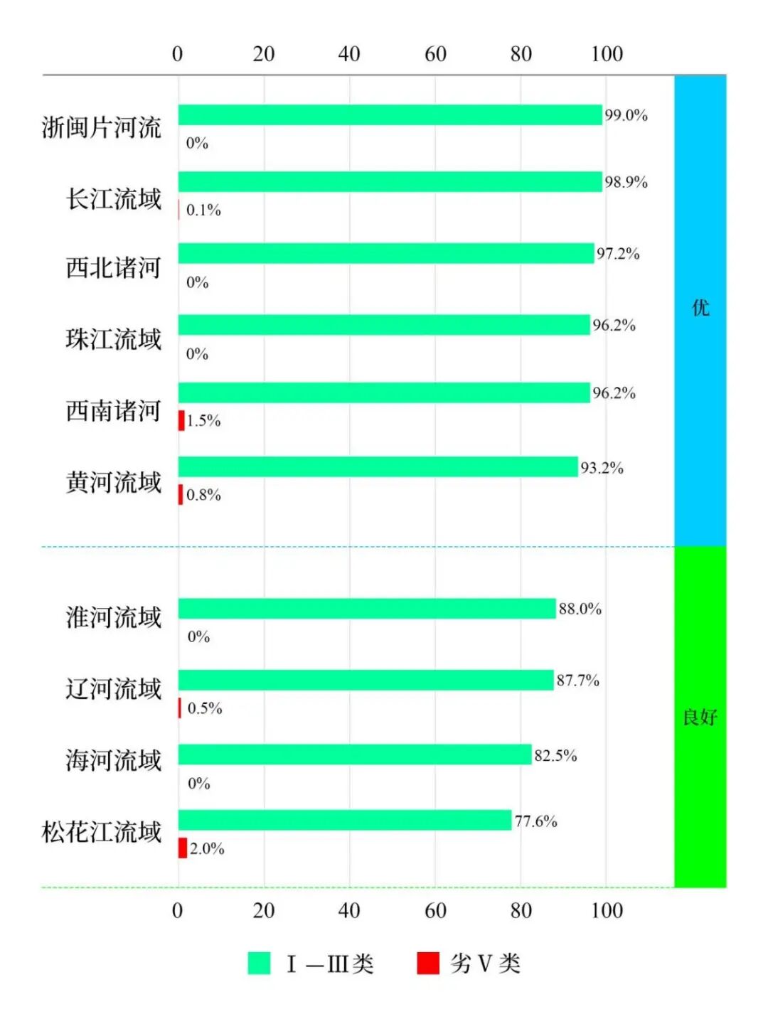 1—12月,长江、黄河、珠江、松花江、淮河、海河、辽河等七大流域及西北诸河、西南诸河和浙闽片河流水质优良(Ⅰ—Ⅲ类)断面比例为93.0%,同比上升0.6个百分点;劣Ⅴ类断面比例为0.4%,同比上升0.1个百分点。主要超标指标为化学需氧量、高锰酸盐指数和五日生化需氧量。其中,浙闽片河流、长江流域、西北诸河、珠江流域、西南诸河和黄河流域水质为优;淮河、辽河、海河和松花江流域水质良好。