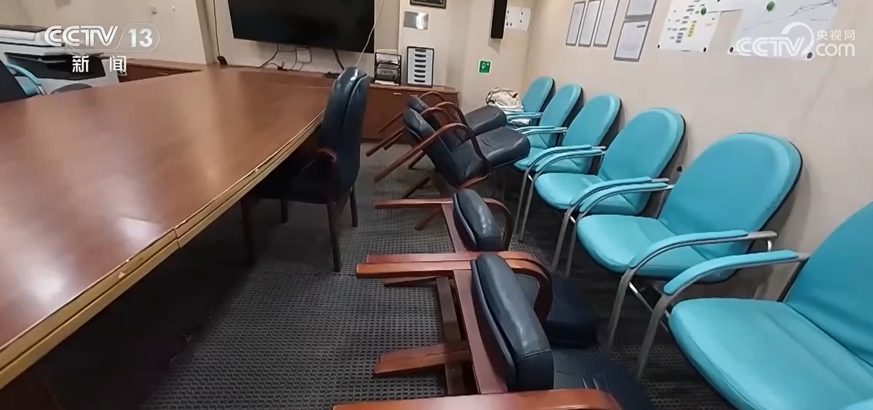 五楼会议室里,两排座椅几乎全部倒下了。不过,这可不是人为放倒的,而是被晃倒的。在驾驶台,记者也用镜头记录下了在巨大涌浪的冲击下“雪龙”号左右大幅摇摆的情形。