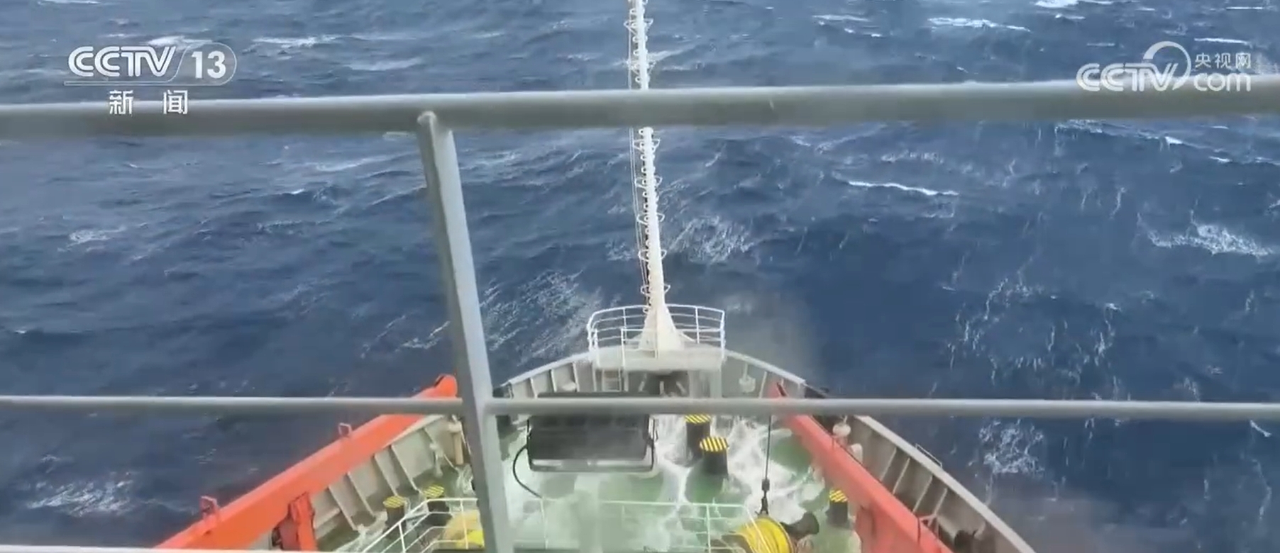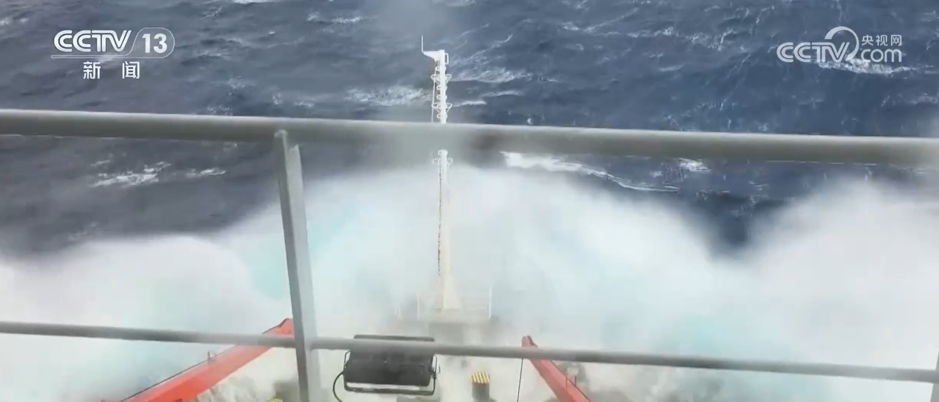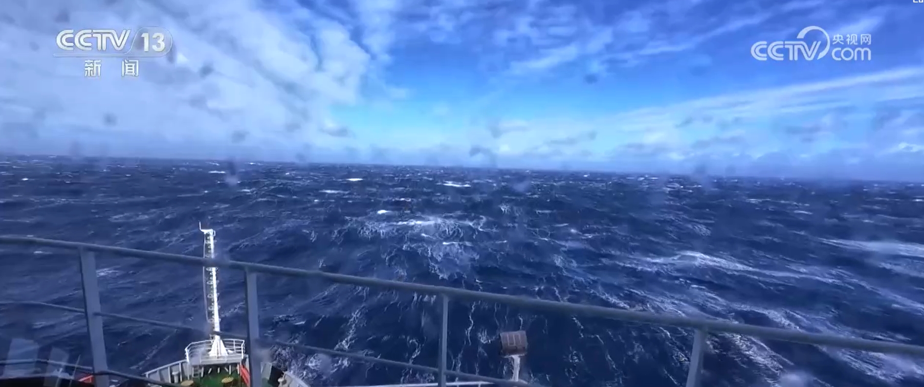 从东南转到西南,“雪龙”号航线实现90度的转变,船身的主要摇摆方向也从“左右晃”变成了“前后颠”。船头不时有大浪袭来。在记者拍下的视频中,甚至记录下了罕见的连续四次巨浪没过船头桅杆的场景。